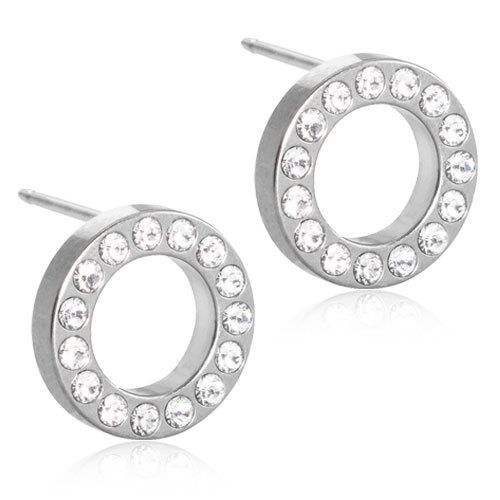 Øreringe udviklet i samråd med hudlæger, i ren medicinsk titan med Swarovski-krystaller. Diameter 10 mm. Art nr 15‑12191‑01.