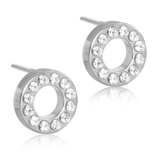 Øreringe udviklet i samråd med hudlæger, i ren medicinsk titan med Swarovski-krystaller. Diameter 8 mm. Art nr 15‑12190‑01.