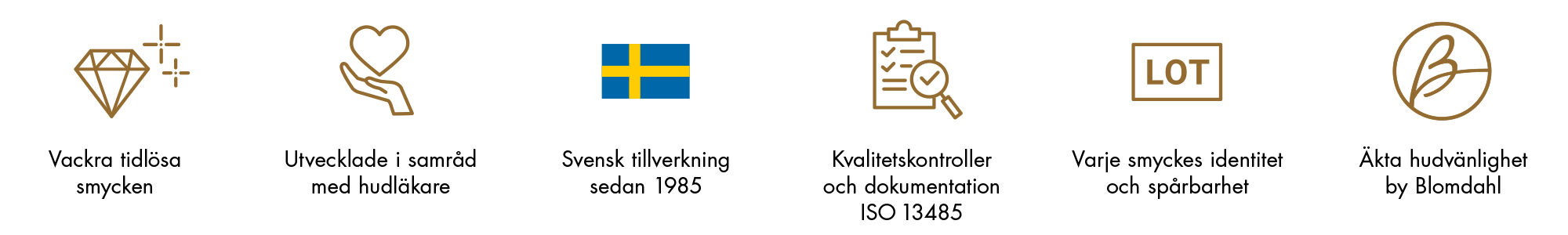 Blomdahl är smyckesmärket där skönhet och hälsa går hand i hand. Vi skapar kvalitetsmycken som inte bara är vackra, utan även skonsamma mot huden. Genom att designa och tillverka våra smycken i Sverige enligt ISO 13485, med noggrann kontroll, detaljerad dokumentation och spårbarhet i varje led, kan vi lova äkta hudvänlighet och toppklassig kvalitet. Dessutom har vi utvecklat våra smycken i samråd med hudläkare, för att ge dig omtänksamma smycken du kan lita på.