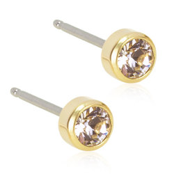 Örhängen utvecklade i samråd med hudläkare, i ren medicinsk titan med Swarovski-kristaller. Guldfärgad ytbeläggning som inte kommer i kontakt med huden. Diameter 4 mm. Art. nr. 15‑1301‑01.