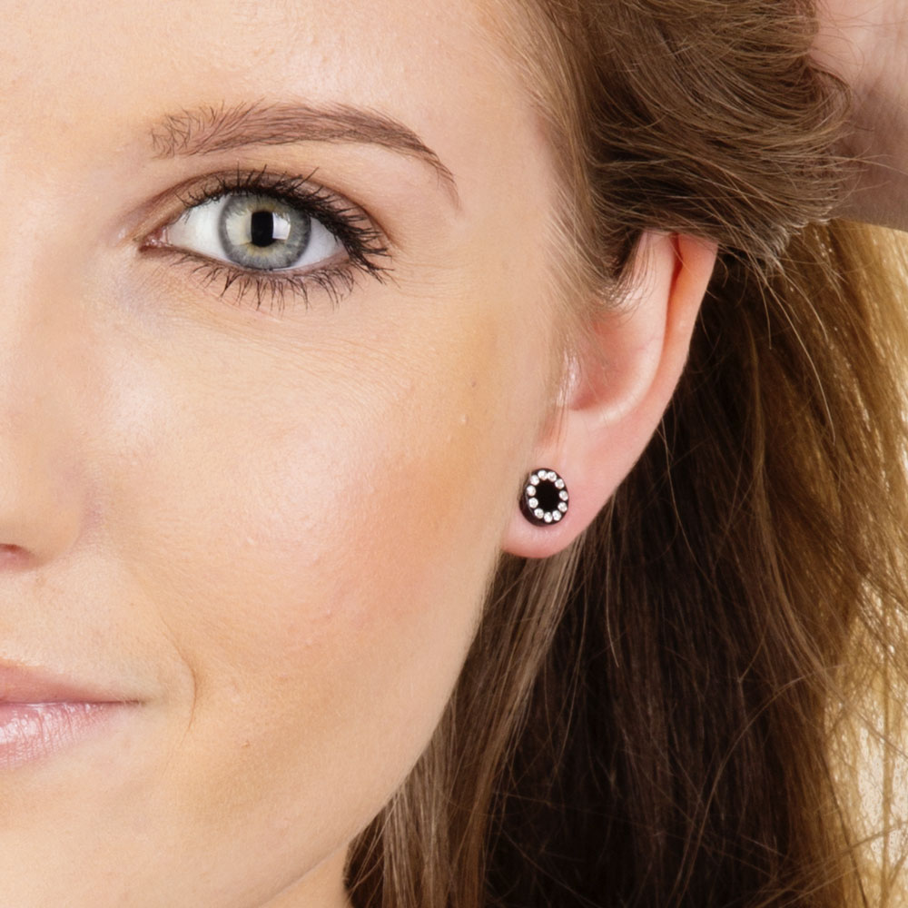 Örhängen utvecklade i samråd med hudläkare, i ren medicinsk titan med Swarovski-kristaller. Svart ytbeläggning som inte kommer i kontakt med huden. Diameter 8 mm. Art. nr. 15‑1591‑01.