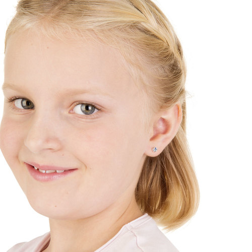 Örhängen utvecklade i samråd med hudläkare, i ren medicinsk plast med Swarovski-kristaller. Diameter 5 mm. Art. nr. 15‑0114‑45.