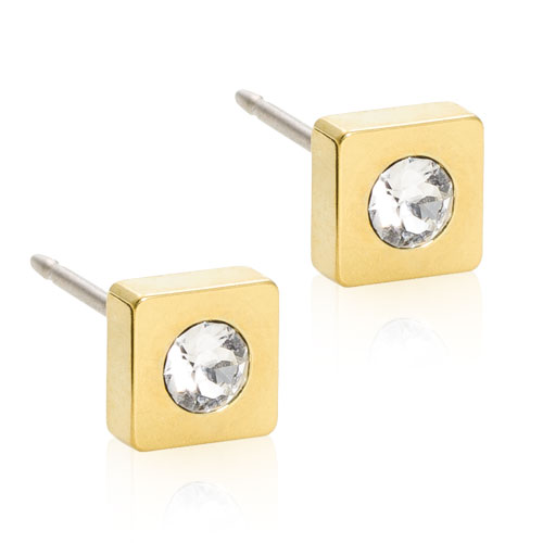 Örhängen utvecklade i samråd med hudläkare, i ren medicinsk titan med Swarovski-kristaller. Guldfärgad ytbeläggning som inte kommer i kontakt med huden. Diameter 7 mm. Art. nr. 15‑1319‑01.