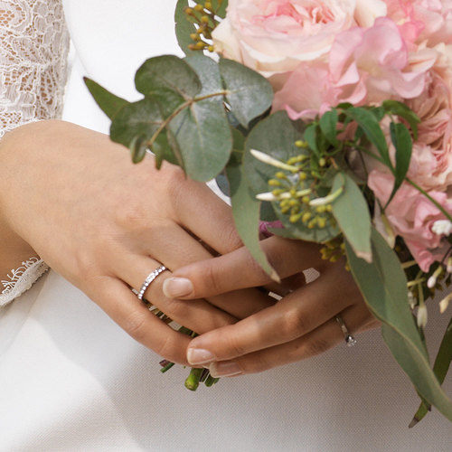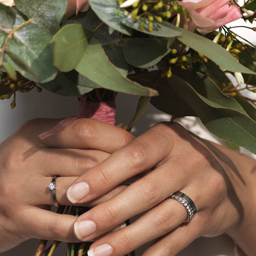 Ring utvecklad i samråd med hudläkare, i medicinsk titan med Swarovski-kristaller. Ringbredd 3 mm, höjd 1,5 mm. Art. nr. 31‑121146‑1601.