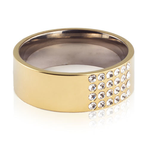 Ring utvecklad i samråd med hudläkare, i medicinsk titan med Swarovski-kristaller. Hudvänlig, guldfärgad ytbeläggning. Ringbredd 6,6 mm, höjd 1,5 mm. Art. nr. 31‑13393‑1601.