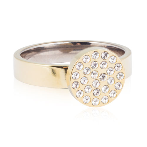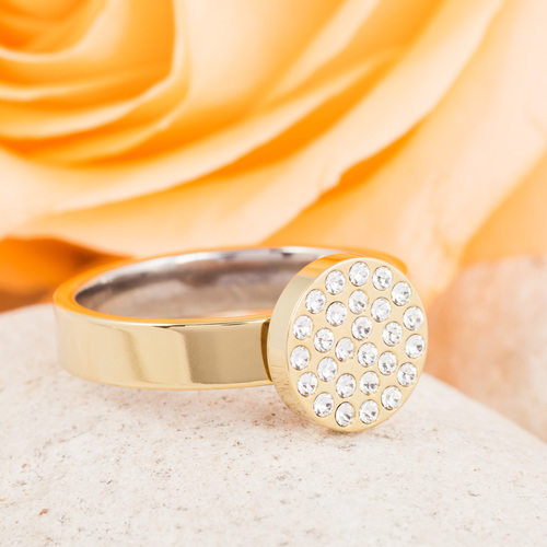 Ring utvecklad i samråd med hudläkare, i medicinsk titan med Swarovski-kristaller. Hudvänlig, guldfärgad ytbeläggning. Ringbredd 4 mm, höjd 1,5 mm. Fattning höjd 2 mm, diameter 10 mm. Art. nr. 31‑13266‑1701.