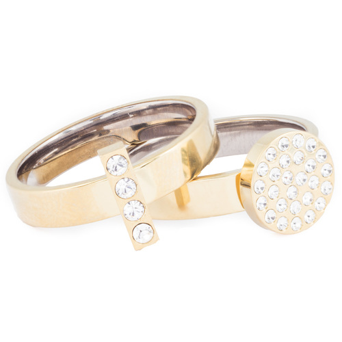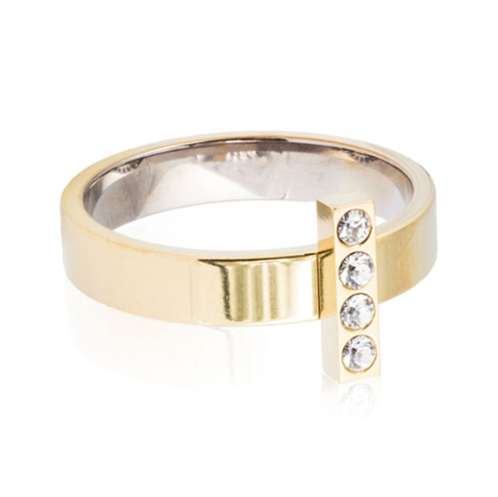 Ring utvecklad i samråd med hudläkare, i medicinsk titan med Swarovski-kristaller. Hudvänlig, guldfärgad ytbeläggning. Ringbredd 4 mm, höjd 1,5 mm. Fattning höjd 2 mm, längd 10 mm. Art. nr. 31‑132196‑1701.