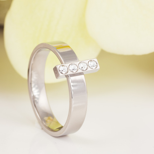 Ring utvecklad i samråd med hudläkare, i medicinsk titan med Swarovski-kristaller. Ringbredd 4 mm, höjd 1,5 mm. Fattning höjd 2 mm, längd 10 mm. Art. nr. 31‑122196‑1901.
