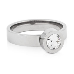 Ring utvecklad i samråd med hudläkare, i medicinsk titan med Swarovski-kristall. Ringbredd 4 mm, höjd 1,5 mm. Fattning höjd 3 mm, diameter 8 mm. Art. nr. 31‑12212‑1801.