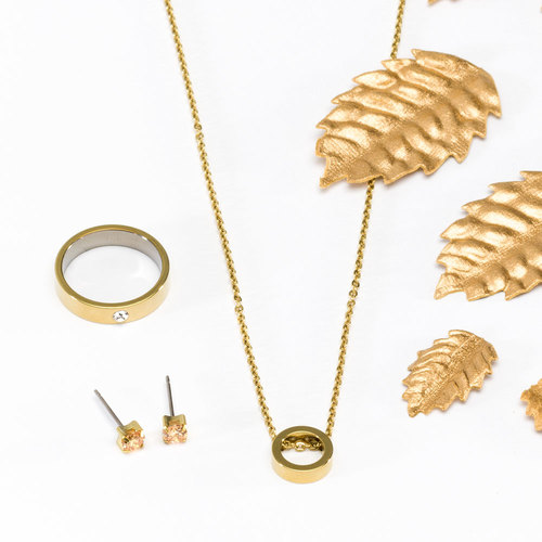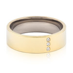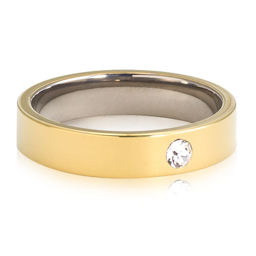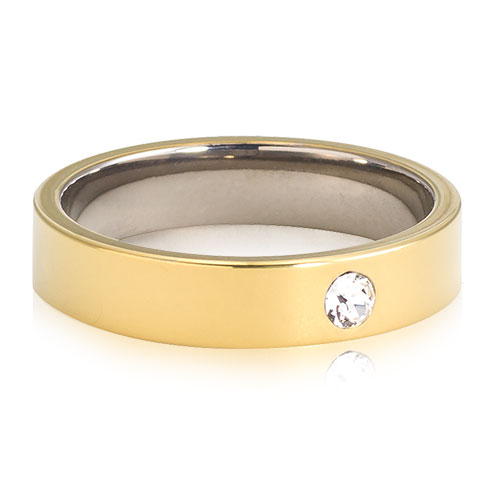 Ring utvecklad i samråd med hudläkare, i medicinsk titan med Swarovski-kristaller. Hudvänlig, guldfärgad ytbeläggning. Ringbredd 4 mm, höjd 1,5 mm. Art. nr. 31‑13219‑1701.