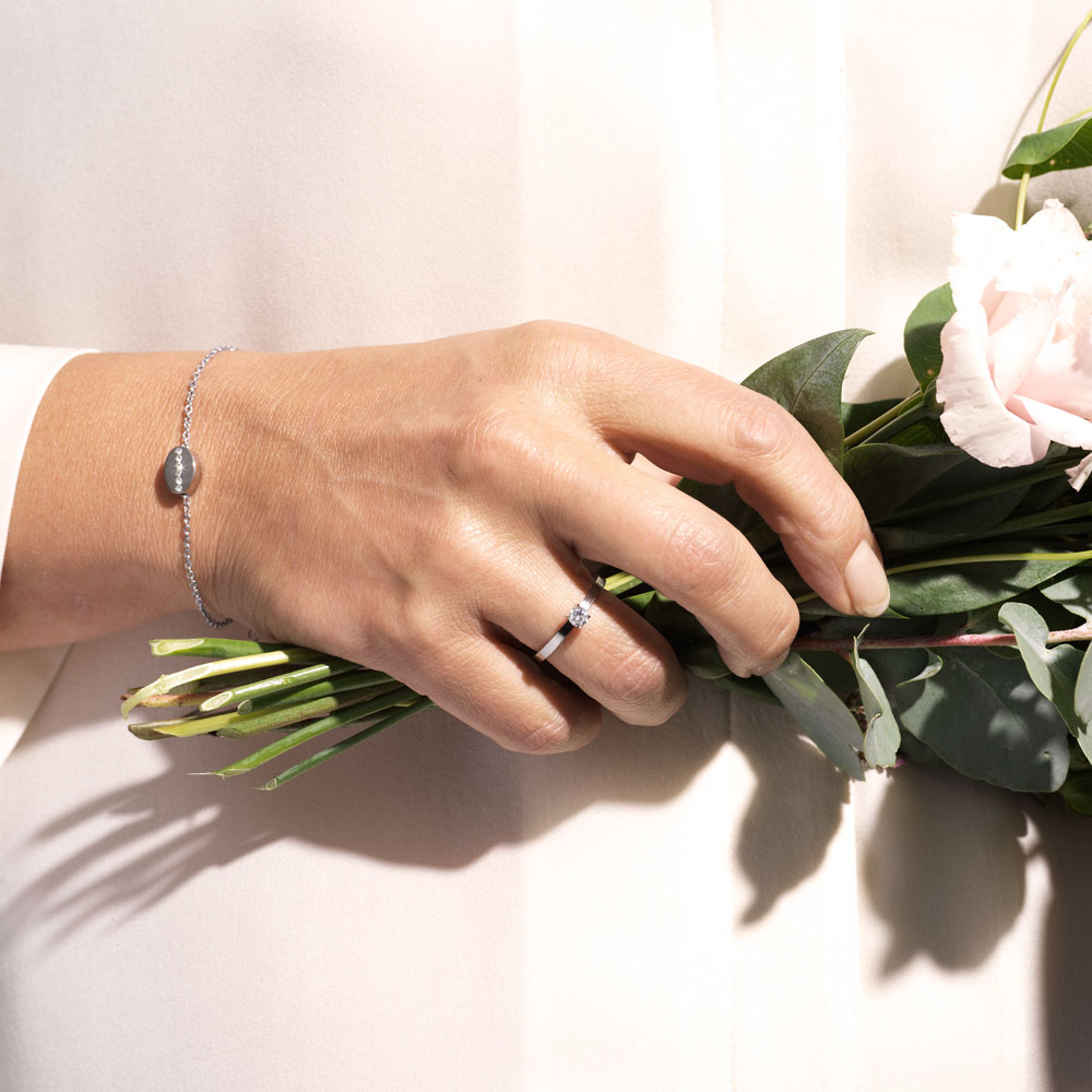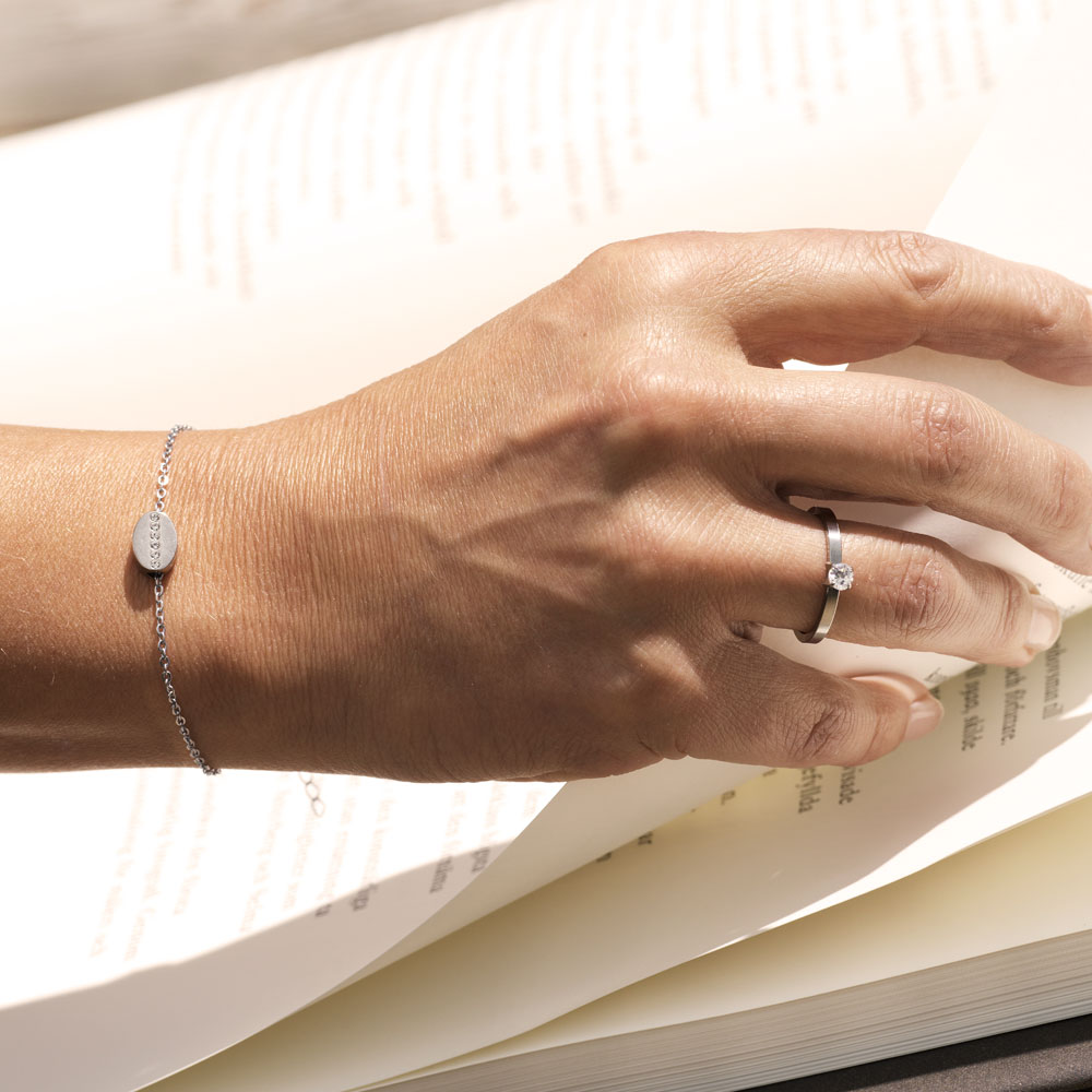 Ring utvecklad i samråd med hudläkare, i medicinsk titan med en ofärgad Cubic Zirconia-sten. Ringbredd 2 mm, höjd 1,5 mm. Fattning höjd 3 mm, diameter 5 mm. Art. nr. 31‑12004‑1930.